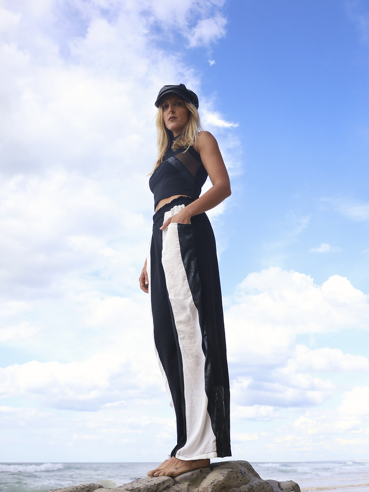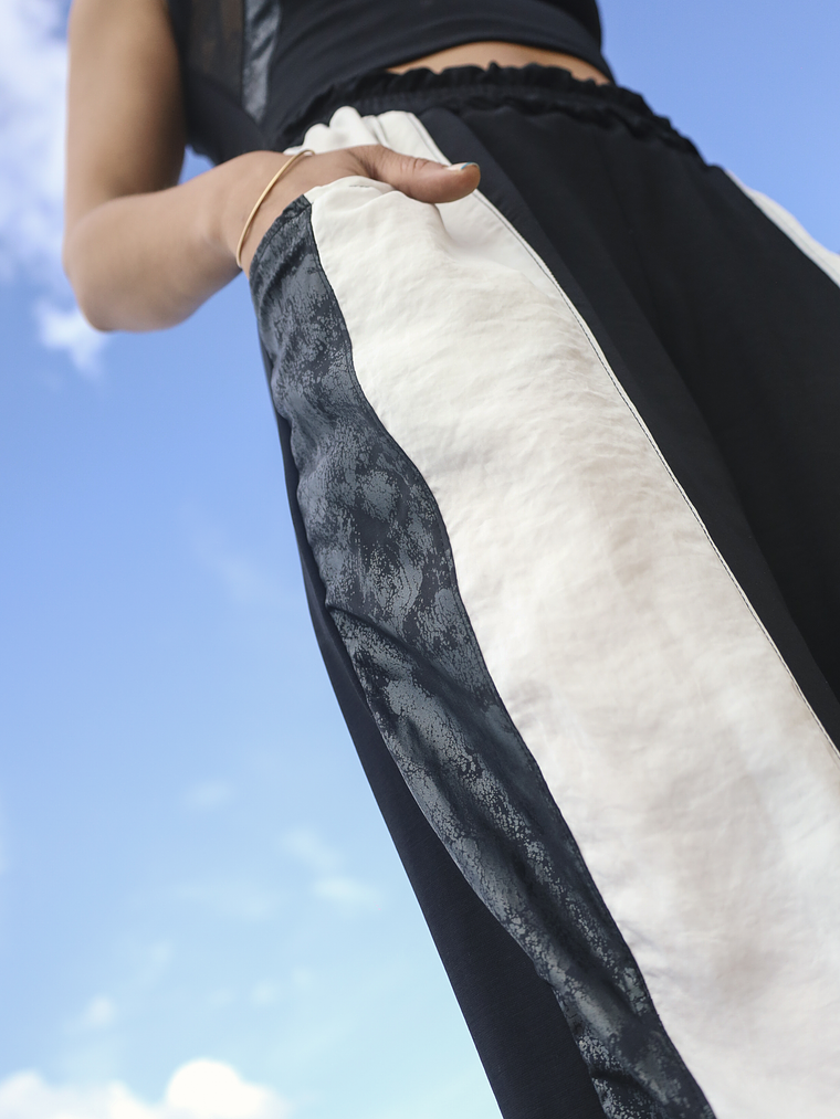 Handcrafted from high-quality recycled fabric, these black and white pants feature a thick elastic waistband for all-day comfort and a relaxed fit. Functional pockets add utility, while reinforced seams ensure durability.