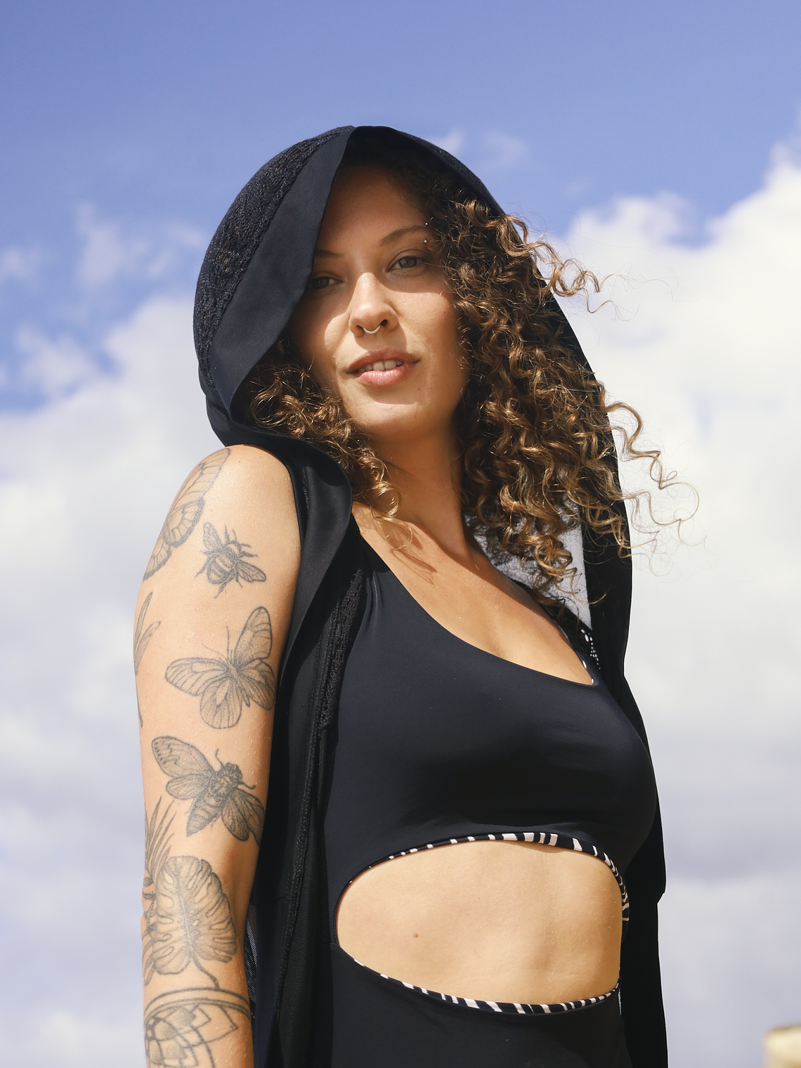Crafted from lightweight, recycled fabric, this kimono combines a relaxed drape with a bold, urban vibe. The wide hood adds a mysterious touch.